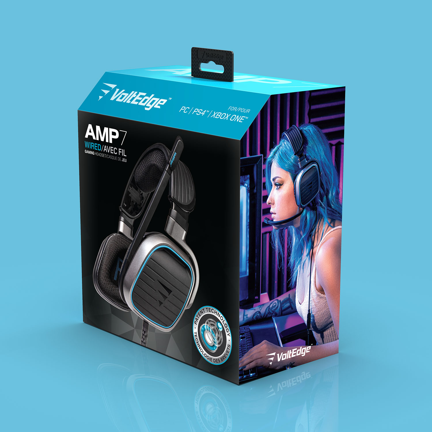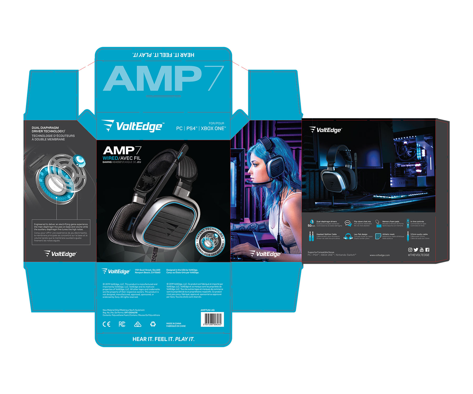 The AMP7 is part of the VoltEdge gaming headset line of products. I was in charge of designing the packaging from start to finish. I was also responsible for the retouched product photography you see throughout the package. I also produced the lifestyle image on the side panel. Since this was one of the flagship products, I incorporated the VoltEdge blue color as the overall theme for the package, setting it apart from the sea of blue/green gaming platform driven packaging.